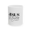 An inspirational ceramic mug featuring the phrase "Jesus, My Combat". The glossy finish and vibrant colors make it a perfect addition to your morning routine, adding a positive and spiritual touch to your day. This mug is ideal for Christians, spiritual individuals, and anyone looking for daily encouragement and motivation. Perfect for religious holidays like Easter and Christmas.